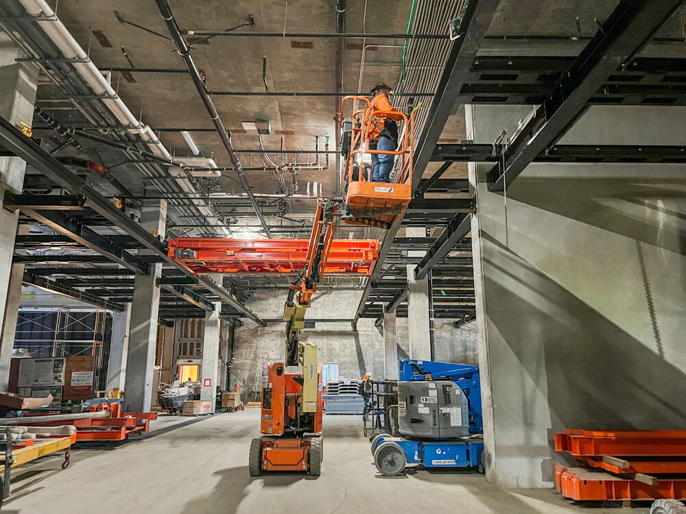 Furthermore, adjacent trade teams – sometimes working overhead of SilMan team members – present risks that require specific protocols and cooperation between tradespersons. SilMan project managers are active participants in the process from the very beginning of the project, long before teams are onsite. Under their experienced, watchful eye, site leaders proactively work with general contractors to address potential conflicts between trades or the use of space near the system or in laydown areas.